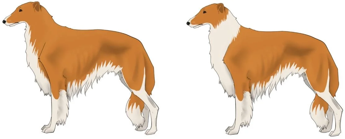 The only two alleles on the A locus that exist in Borzoi and Silken Windhoudns are Ay and at. However, UC Davis has updated their A locus reporting to separate Ay into “dominant yellow” (ASIPᵈʸ) and “shaded yellow (ASIPˢʸ), as well as giving saddle it’s own A locus allele as “black saddle” (ASIPᵇˢ). They also report 3 different variants of the at allele as “black back” 1-3 (ASIPᵇᵇ¹, ASIPᵇᵇ², ASIPᵇᵇ³). The hierarchy of dominance in borzoi and silkens is as follows: ASIPᵈʸ, ASIPˢʸ, ASIPᵇˢ, ASIPᵇᵇ¹, ASIPᵇᵇ², ASIPᵇᵇ³. Read more here.