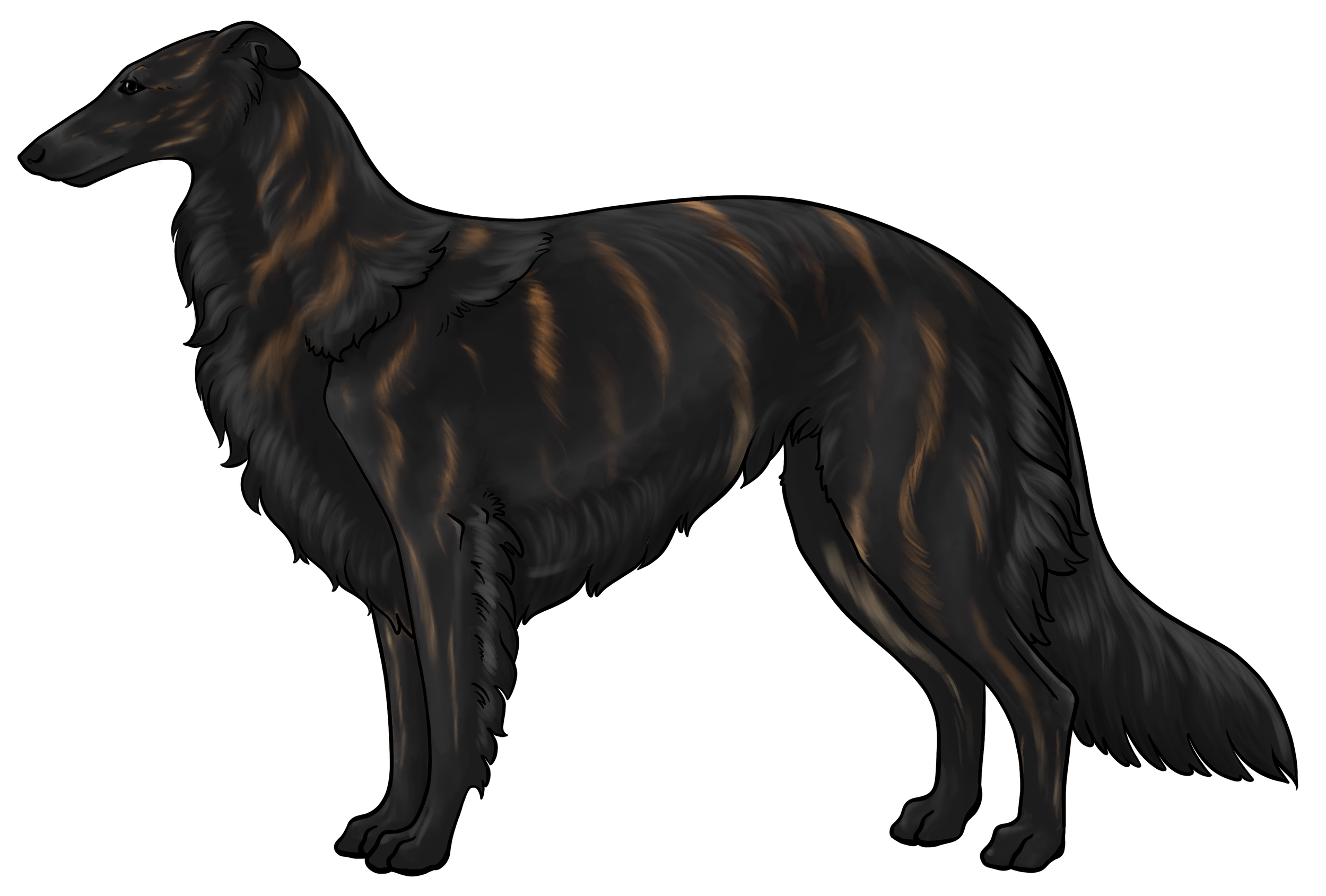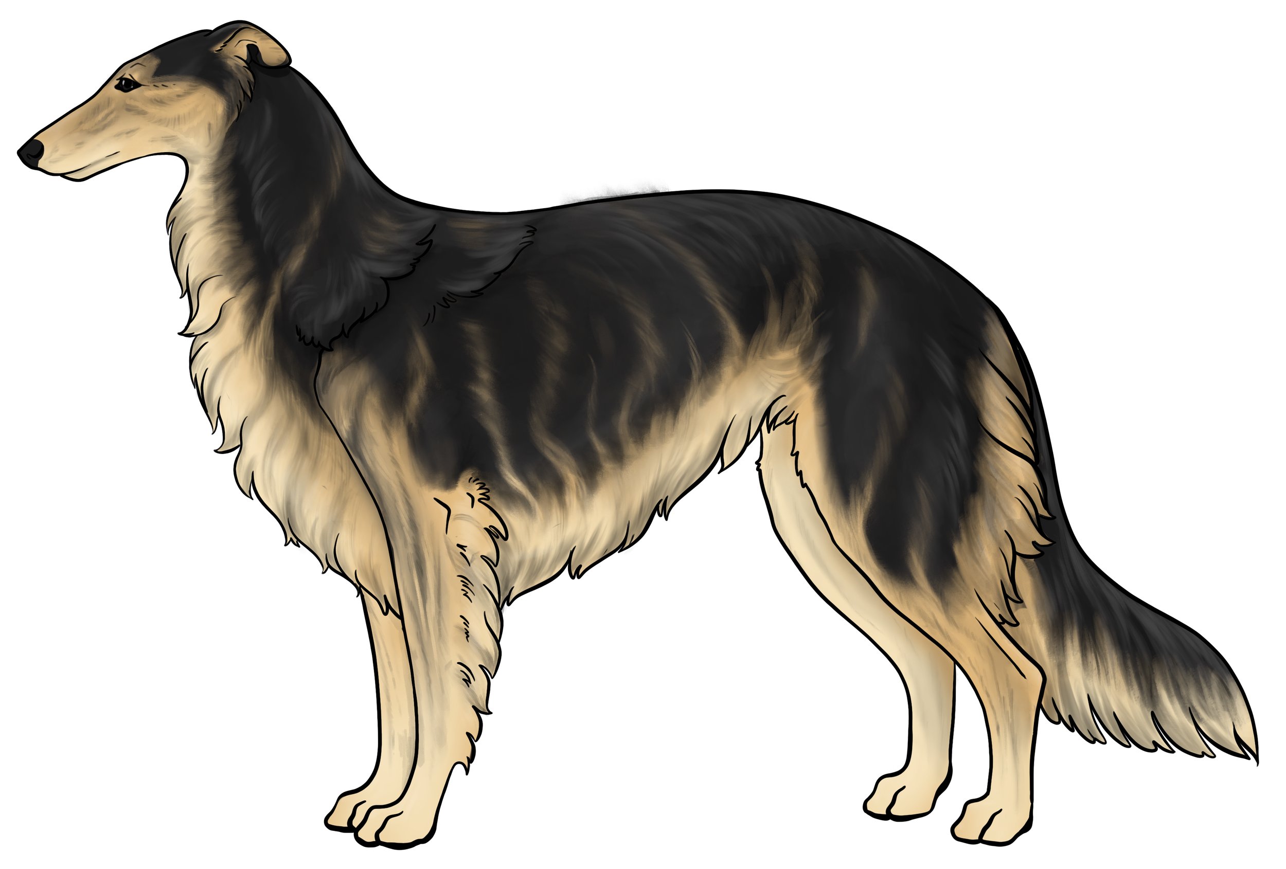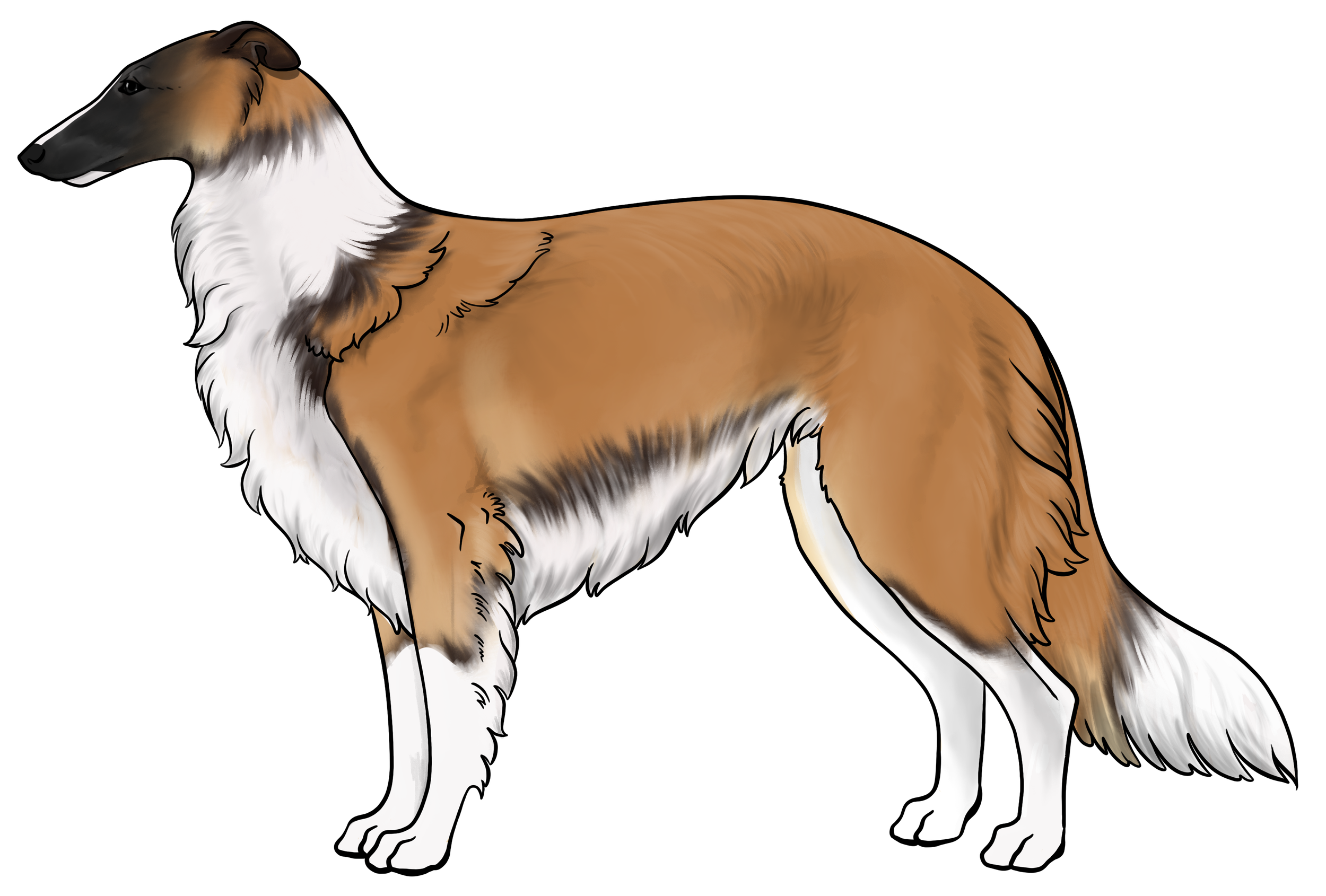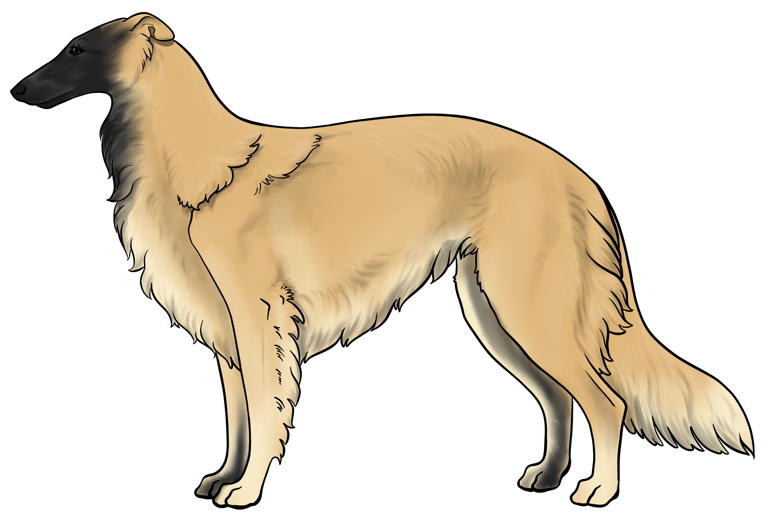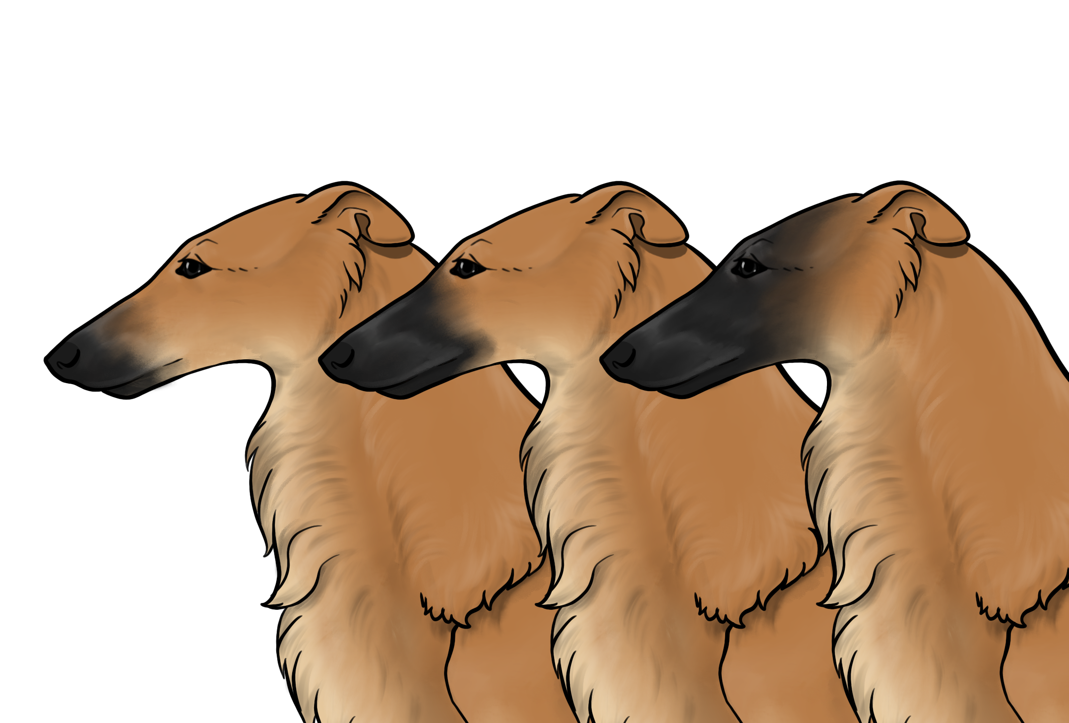 Masking: Masks are the most dominant allele on the E locus. It is characterized by black hairs on the face. The mask can be restricted to just around the nose and lips, or cover the entire head, ranging everywhere in between. Sometimes masks can be so extensive that they create black hairs down the neck, on the inner legs, and undersides (second illustration). This is often called “extreme masking” and is commonly seen in brees like the Belgain Maliois. While we have yet to see this specific phenotype in silken windhounds, the presence of watermarking, which is most often paired with heavy-extreme masking, would suggest that it is a possible phenotype in Silken Windhounds.