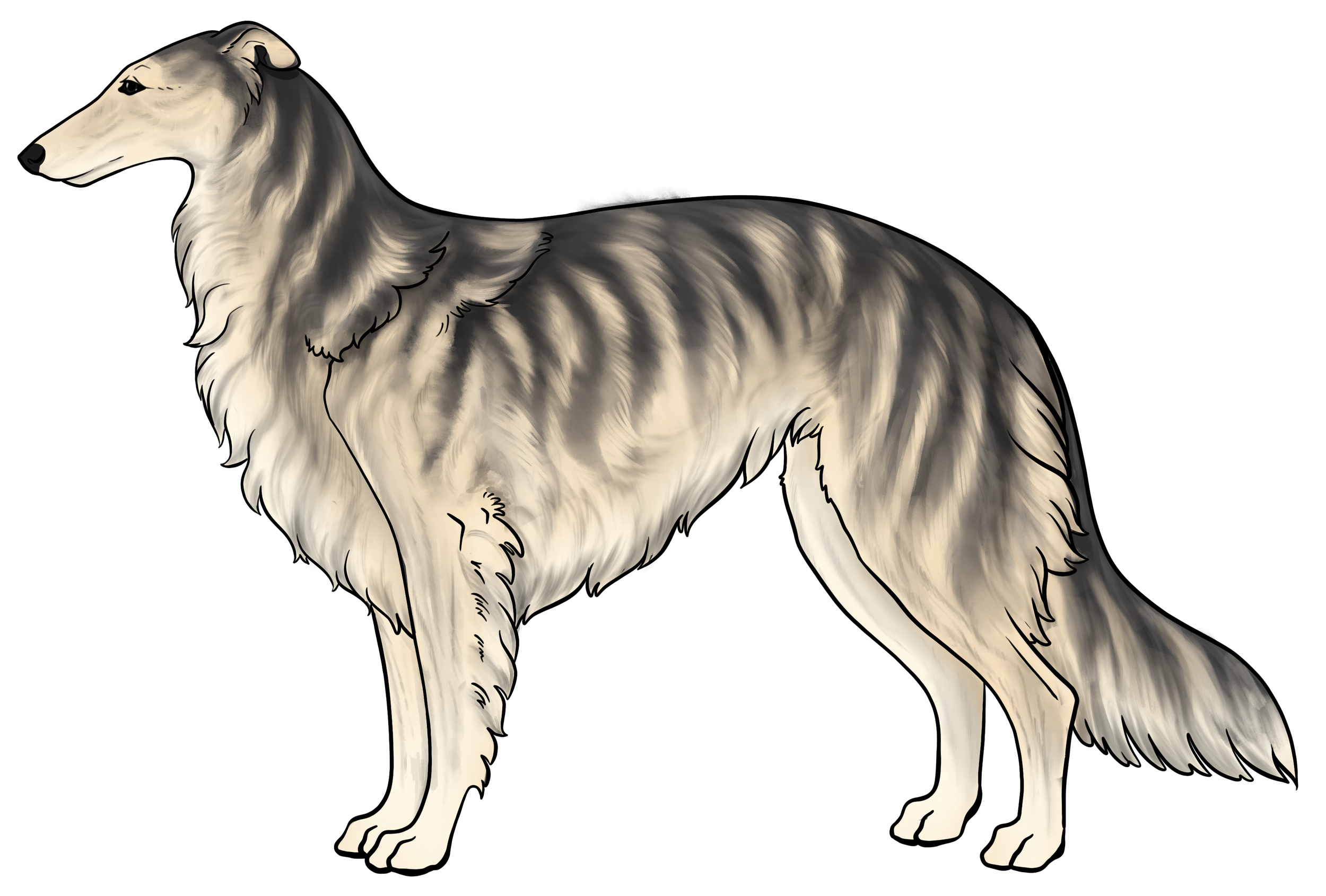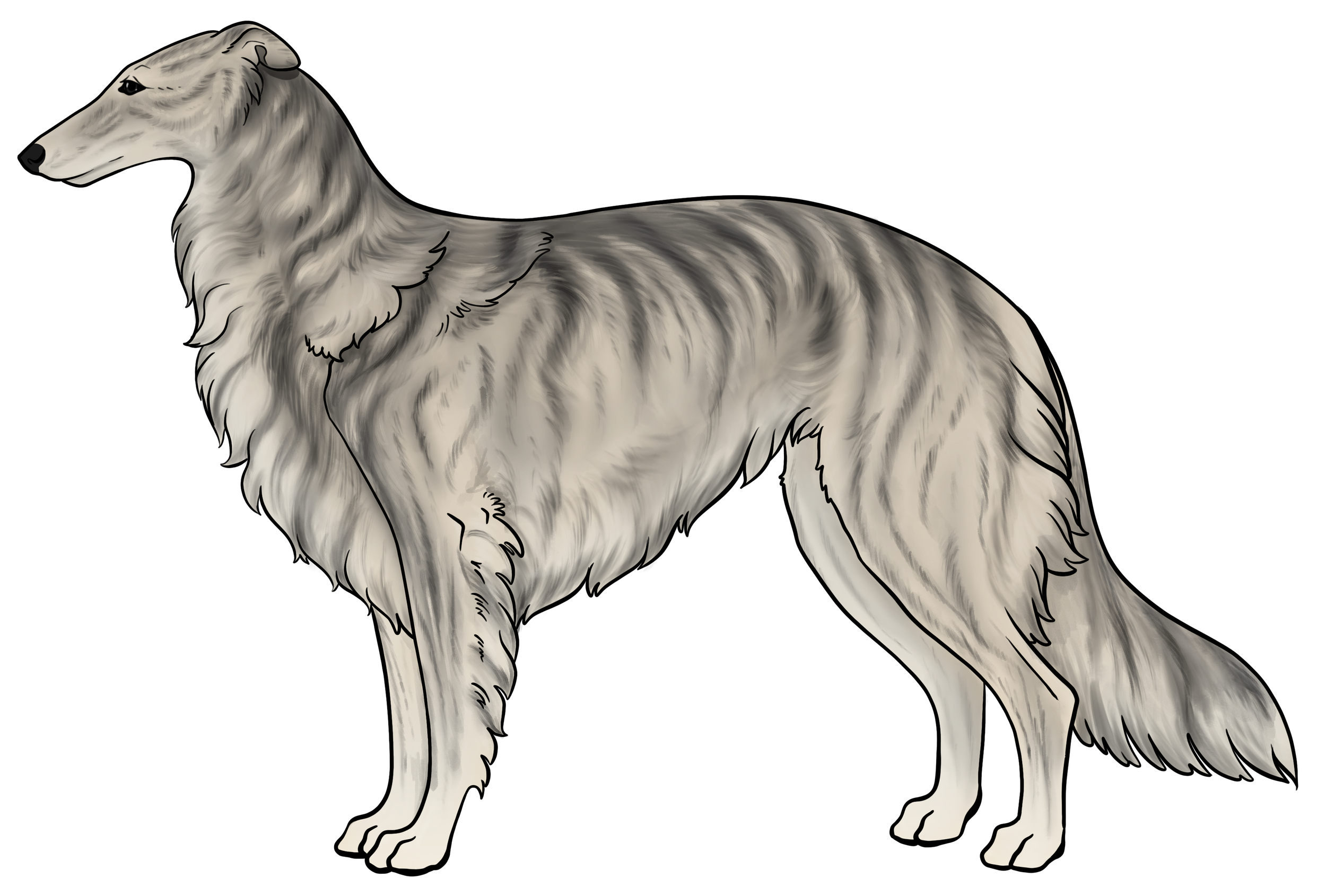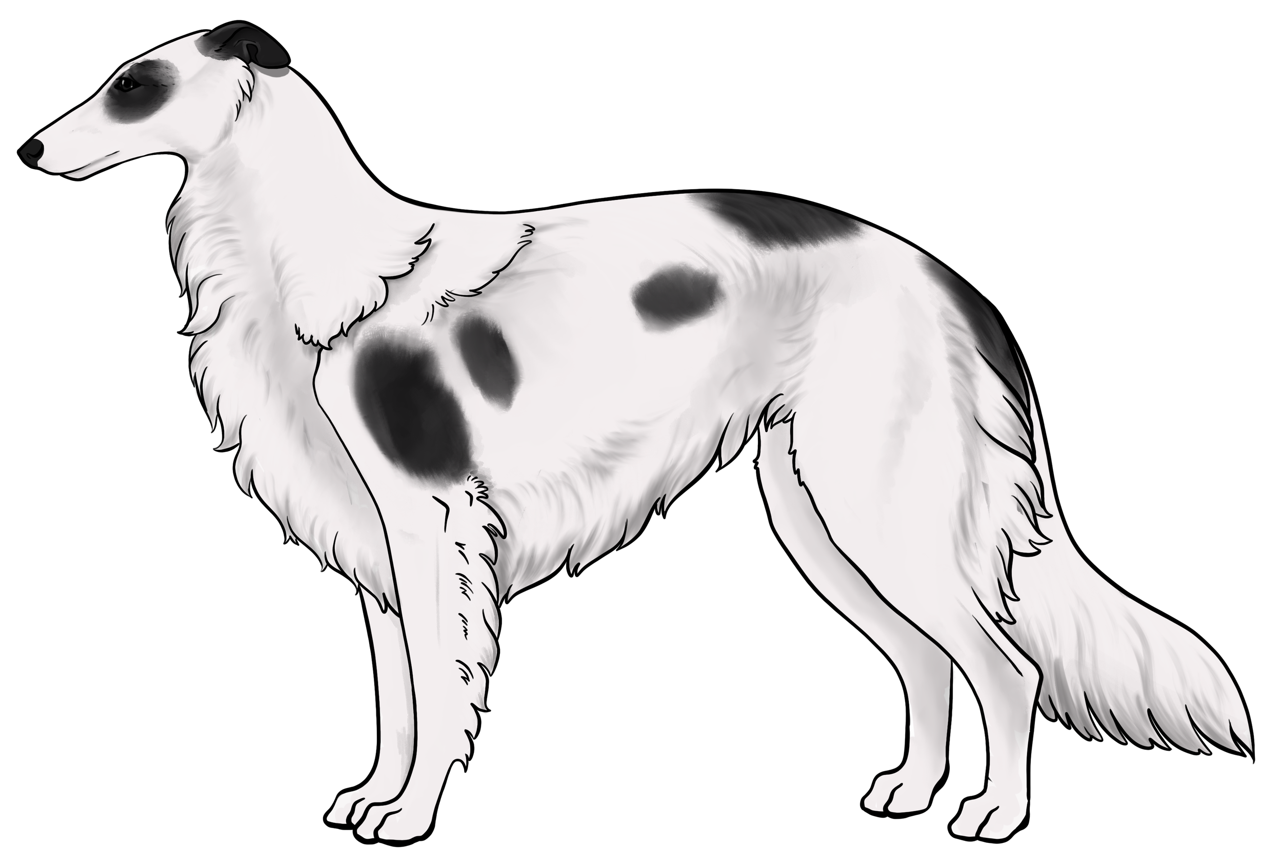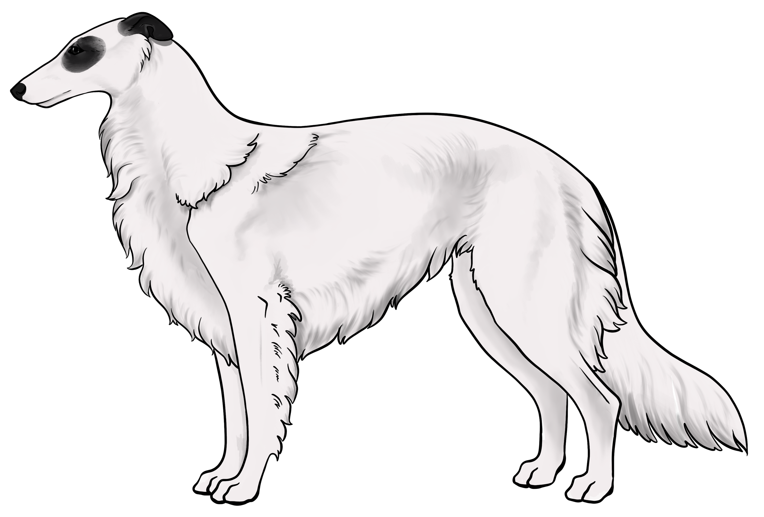 Masking: Masks are the most dominant allele on the E locus. It is characterized by black hairs on the face. The mask can be restricted to just around the nose and lips, or cover the entire head, ranging everywhere in between. Sometimes masks can be so extensive that they create black hairs down the neck, on the inner legs, and undersides (second illustration). This is often called “extreme masking” and is commonly seen in brees like the Belgain Maliois. While we have yet to see this specific phenotype in silken windhounds, the presence of watermarking, which is most often paired with heavy-extreme masking, would suggest that it is a possible phenotype in Silken Windhounds.