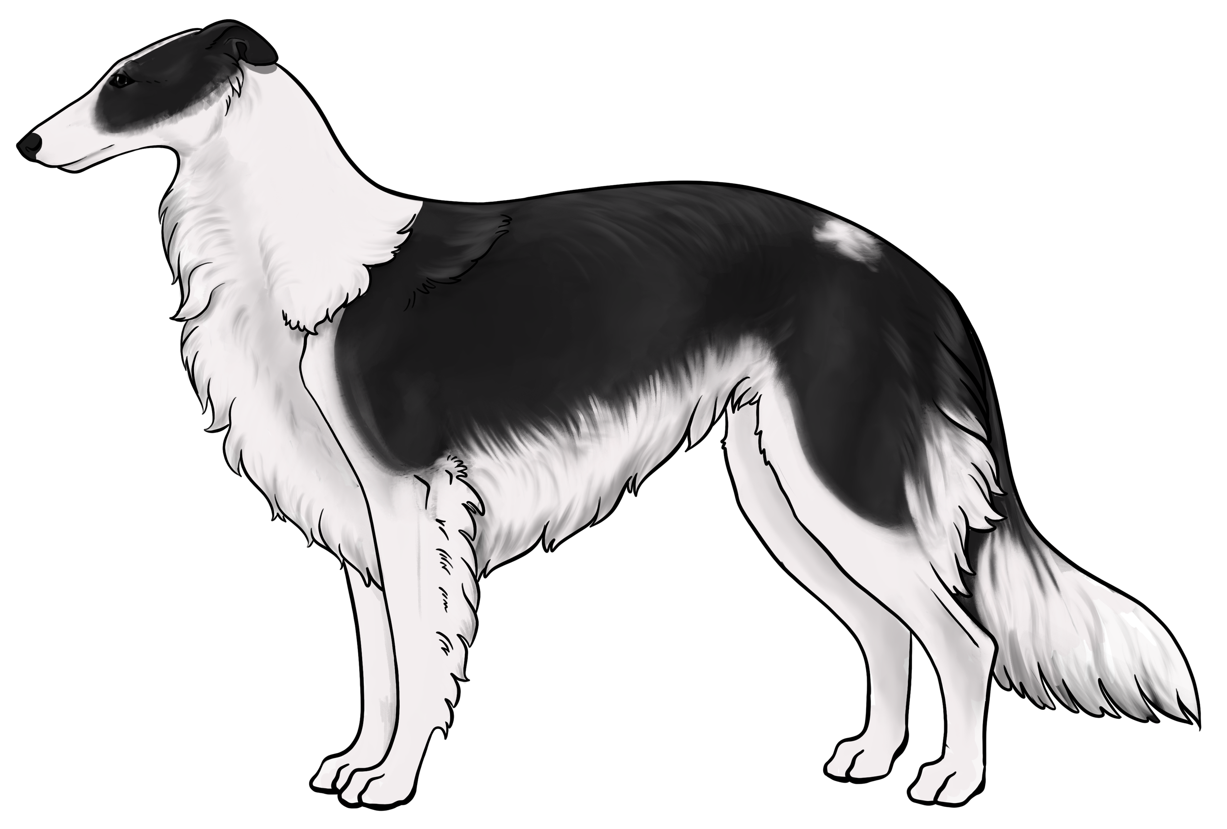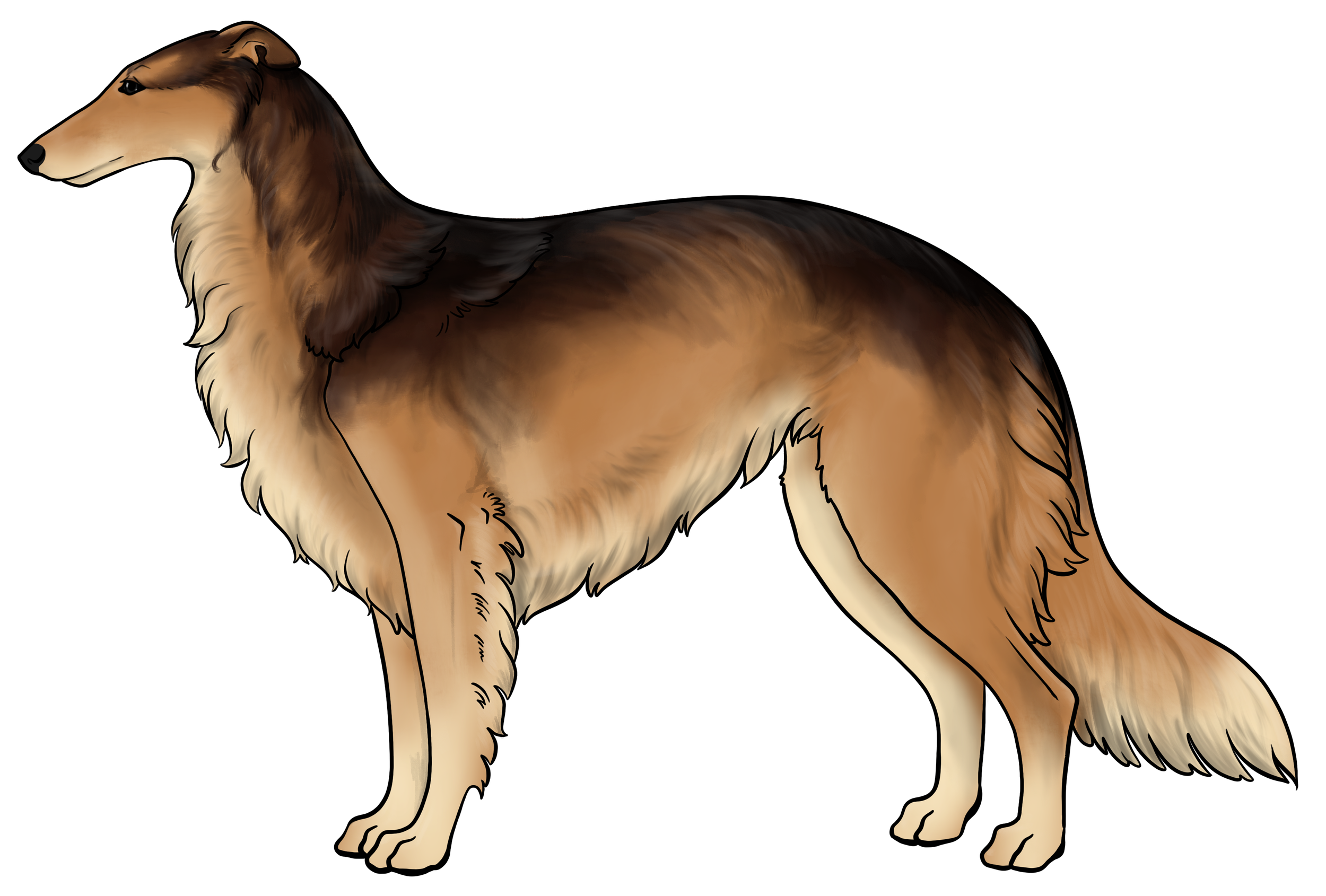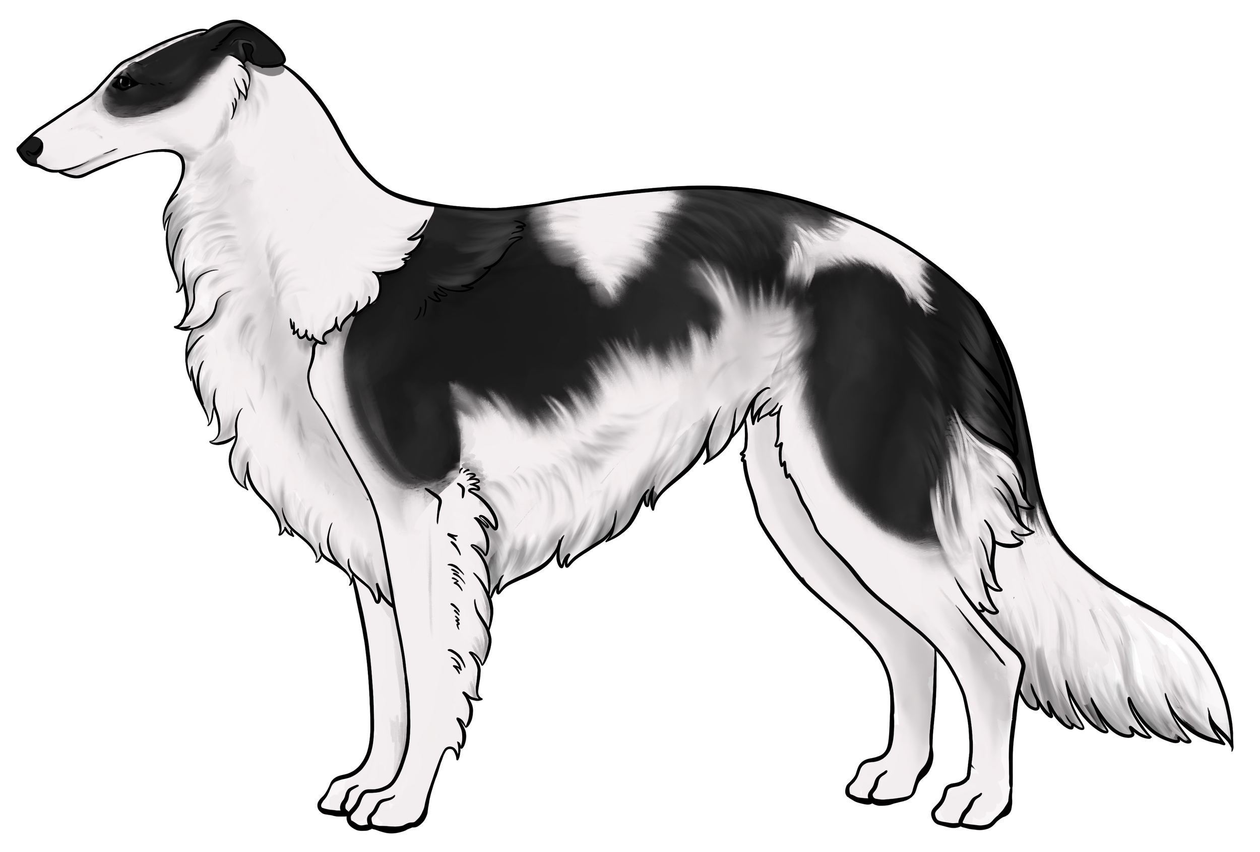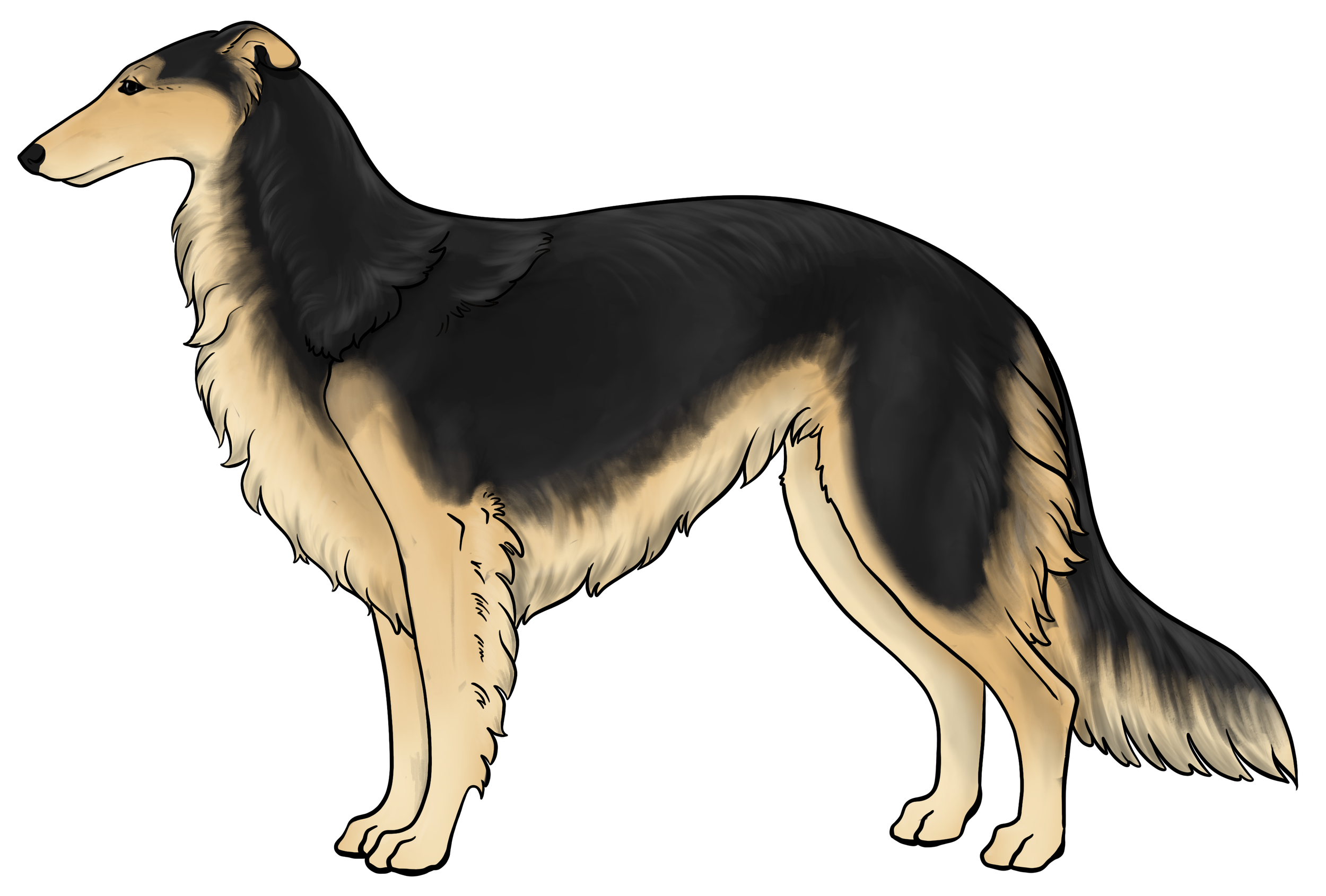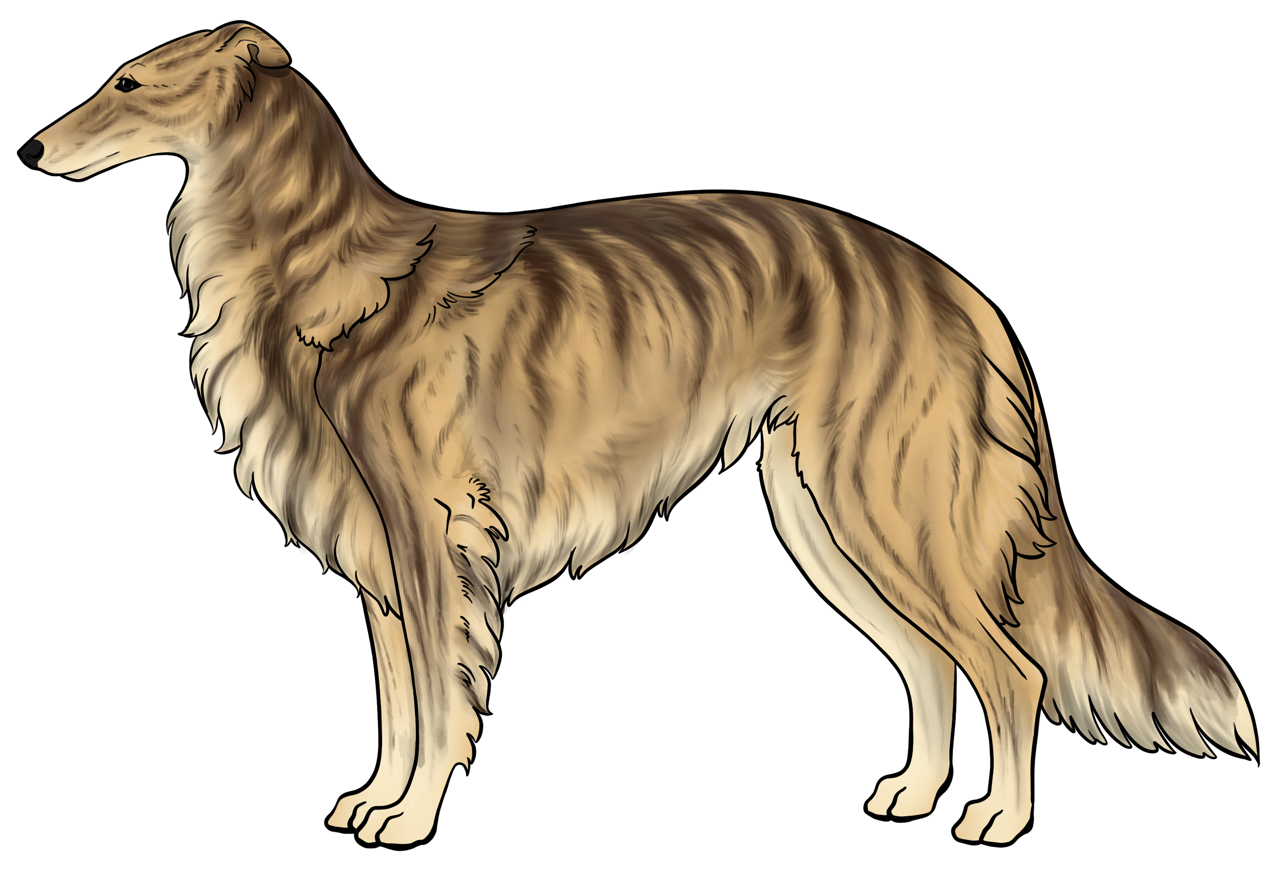 Masking: Masks are the most dominant allele on the E locus. It is characterized by black hairs on the face. The mask can be restricted to just around the nose and lips, or cover the entire head, ranging everywhere in between. Sometimes masks can be so extensive that they create black hairs down the neck, on the inner legs, and undersides (second illustration). This is often called “extreme masking” and is commonly seen in brees like the Belgain Maliois. While we have yet to see this specific phenotype in silken windhounds, the presence of watermarking, which is most often paired with heavy-extreme masking, would suggest that it is a possible phenotype in Silken Windhounds.