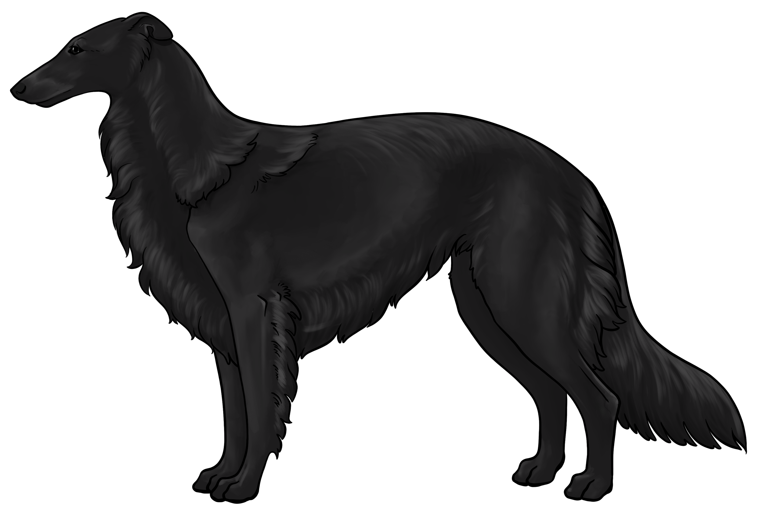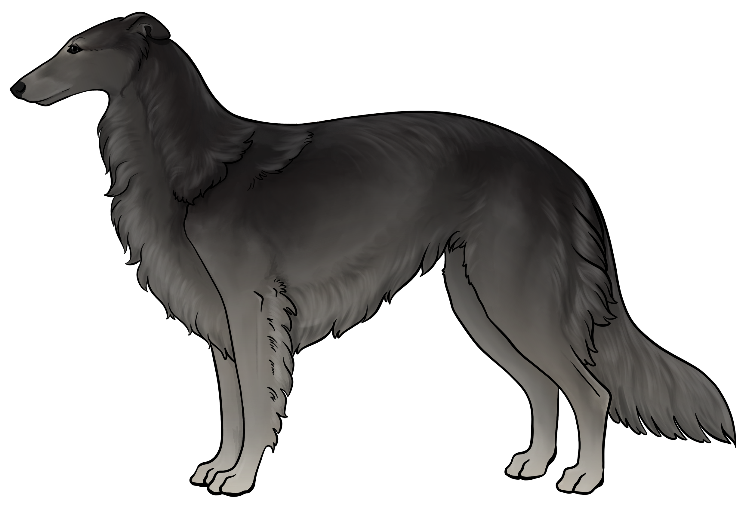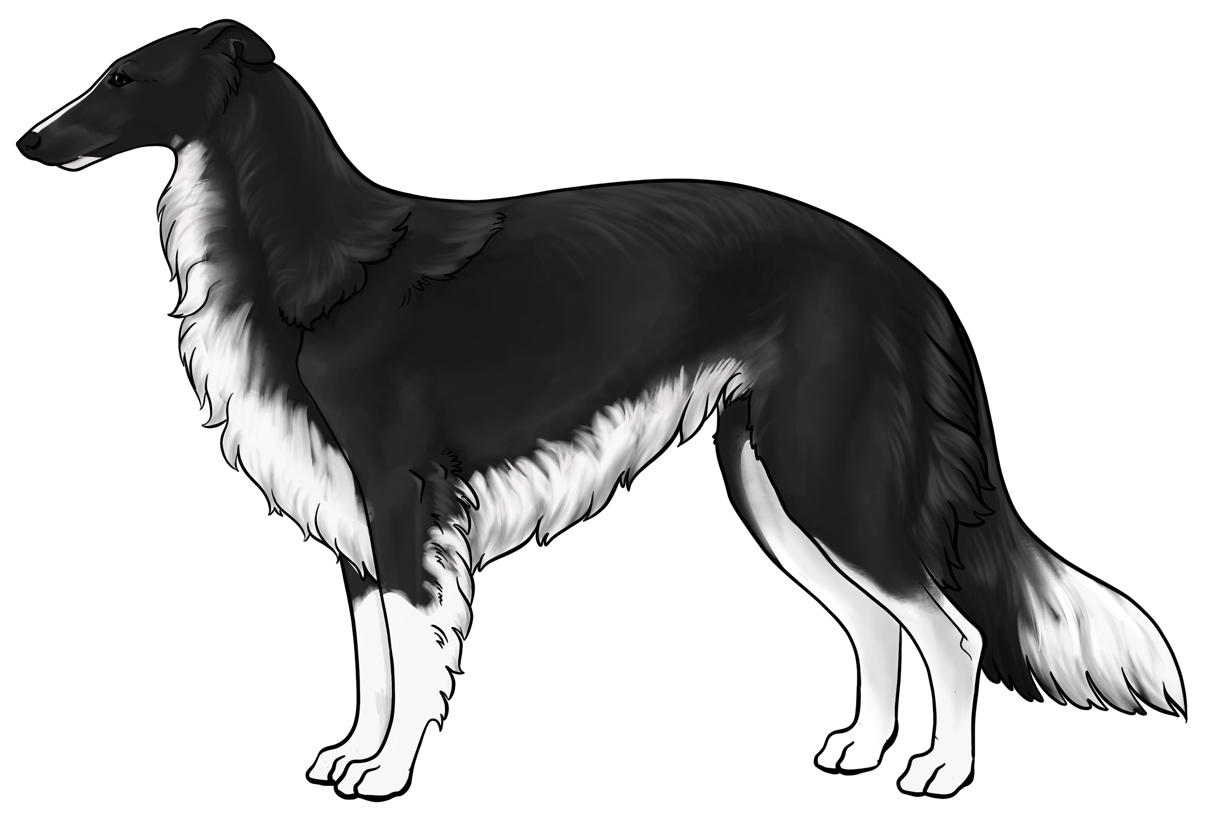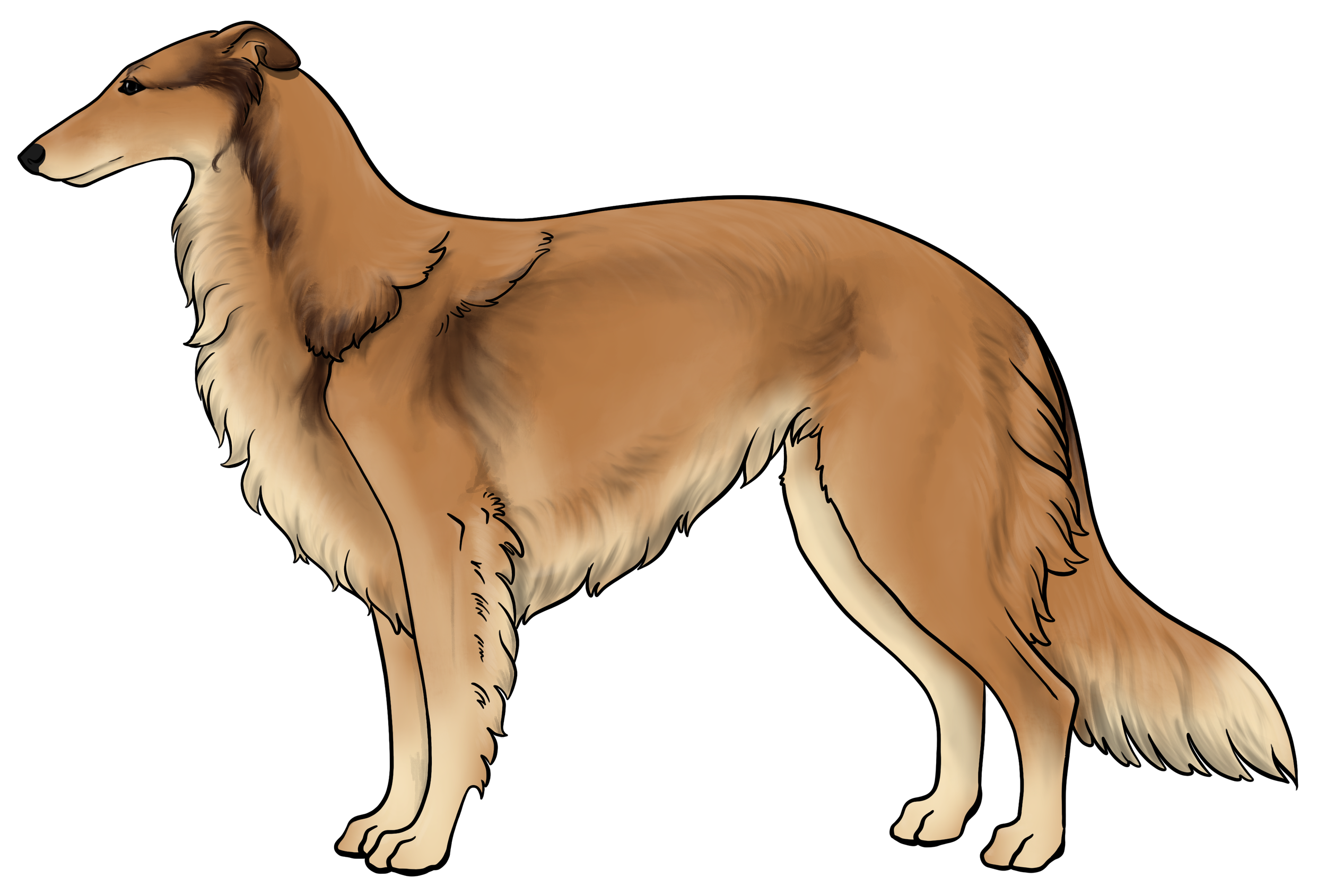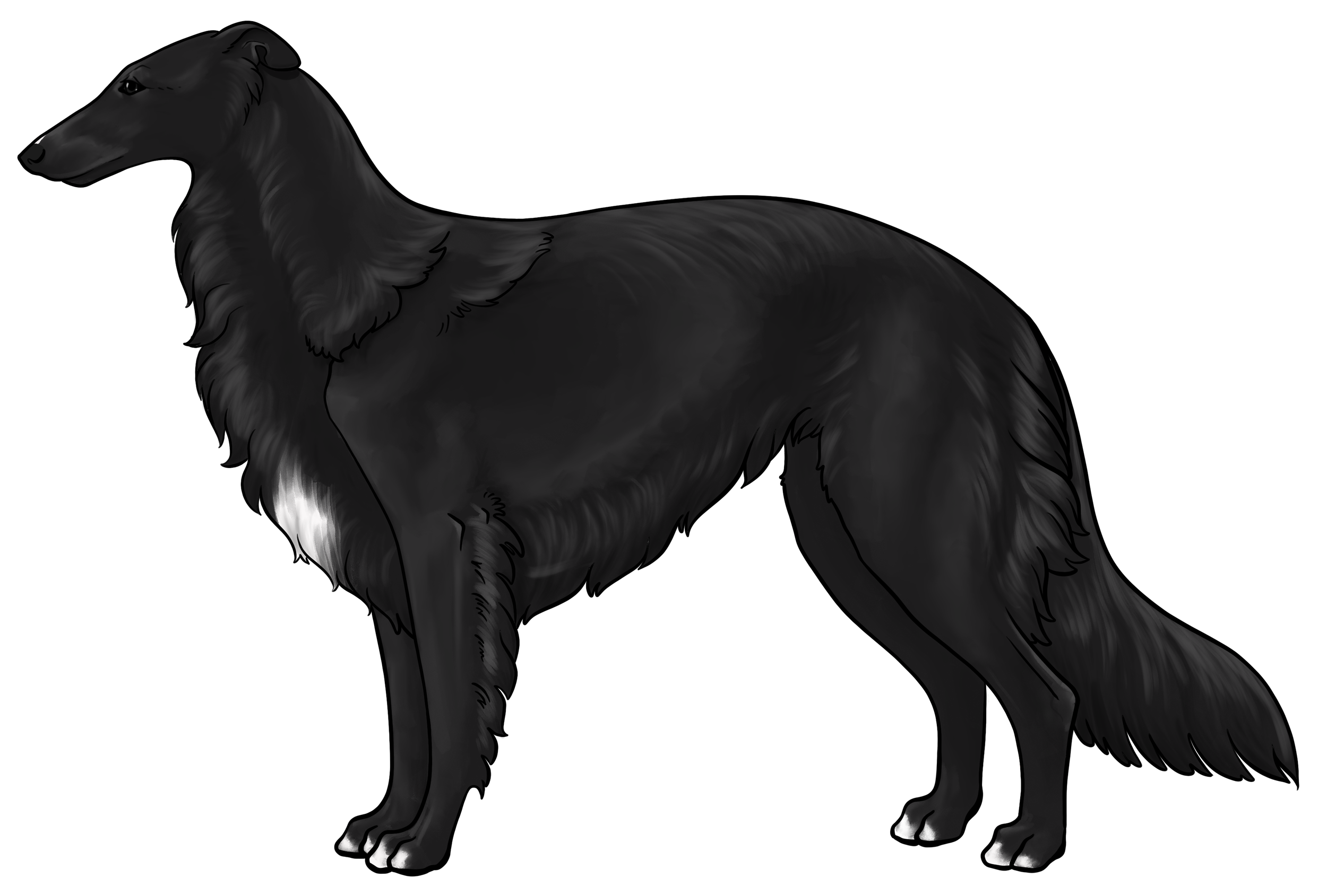 Masking: Masks are the most dominant allele on the E locus. It is characterized by black hairs on the face. The mask can be restricted to just around the nose and lips, or cover the entire head, ranging everywhere in between. Sometimes masks can be so extensive that they create black hairs down the neck, on the inner legs, and undersides (second illustration). This is often called “extreme masking” and is commonly seen in brees like the Belgain Maliois. While we have yet to see this specific phenotype in silken windhounds, the presence of watermarking, which is most often paired with heavy-extreme masking, would suggest that it is a possible phenotype in Silken Windhounds.
